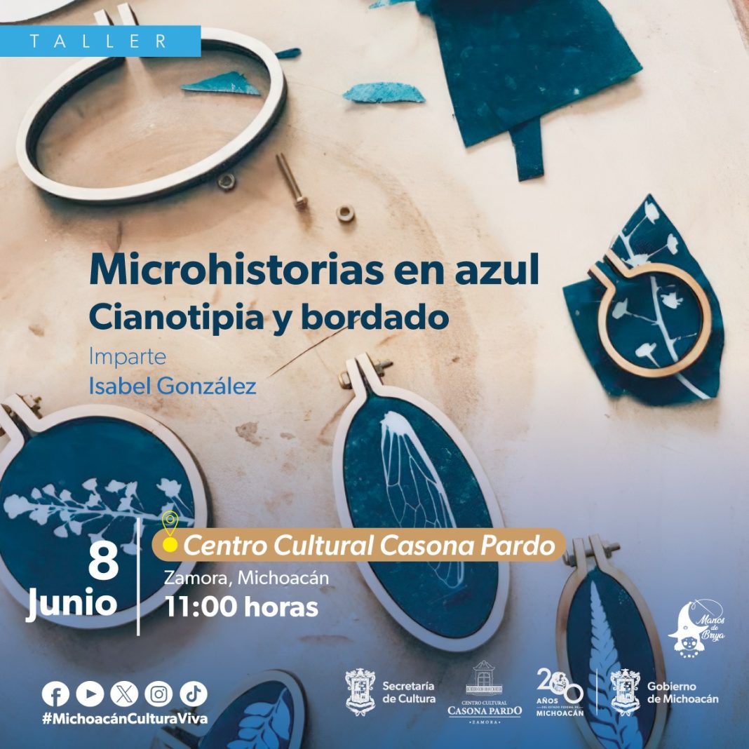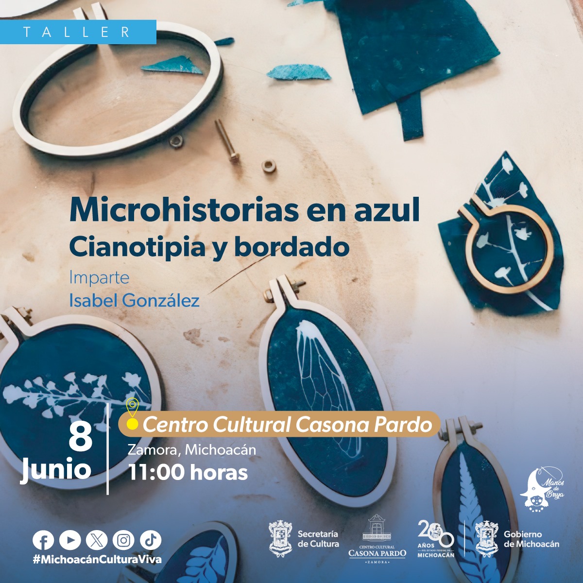 Zamora, Michoacán.- A través del Centro Regional de las Artes de Michoacán (CRAM), ubicado en Zamora, la Secretaría de Cultura de Michoacán (Secum) pone a tu disposición el taller de cianotipia y bordado Micro historias en azul, dirigido a todas las personas que quieran comunicar y compartir un trabajo estético, que se llevará a cabo en el Centro Cultural Casona Pardo, el 8 de junio de 11:00 a 13:00 horas, y que será impartido por Isabel González.