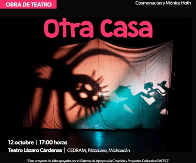 Pátzcuaro, Mich.- La Secretaría de Cultura de Michoacán (Secum) invita a la obra de teatro Otra Casa, a cargo del grupo invitado Cosmonautas y Mónica Hoth, el próximo 12 de octubre a las 17:00 horas, en el teatro Lázaro Cárdenas del Centro Dramático de Michoacán (Cedram), en Pátzcuaro.