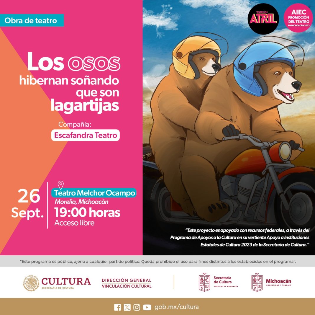 “Los osos que hibernan soñando que son lagartijas” se presentará el siguiente martes 26 de septiembre a las 17:00 horas, en el marco de la iniciativa Martes de Teatro, en el Teatro Melchor Ocampo que se encuentra en la calle Melchor Ocampo número 256, esquina con Guillermo Prieto, en el Centro Histórico de Morelia.