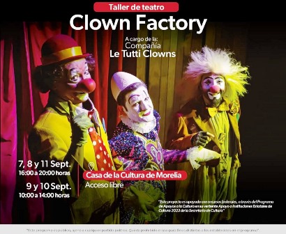 Como parte del Proyecto de Apoyo a Instituciones Estatales de Cultura (AIEC) 2023, la Secretaría de Cultura de Michoacán (Secum) invita al taller de “Clown Factory”, del 7 al 11 de septiembre en la Casa de la Cultura de Morelia.