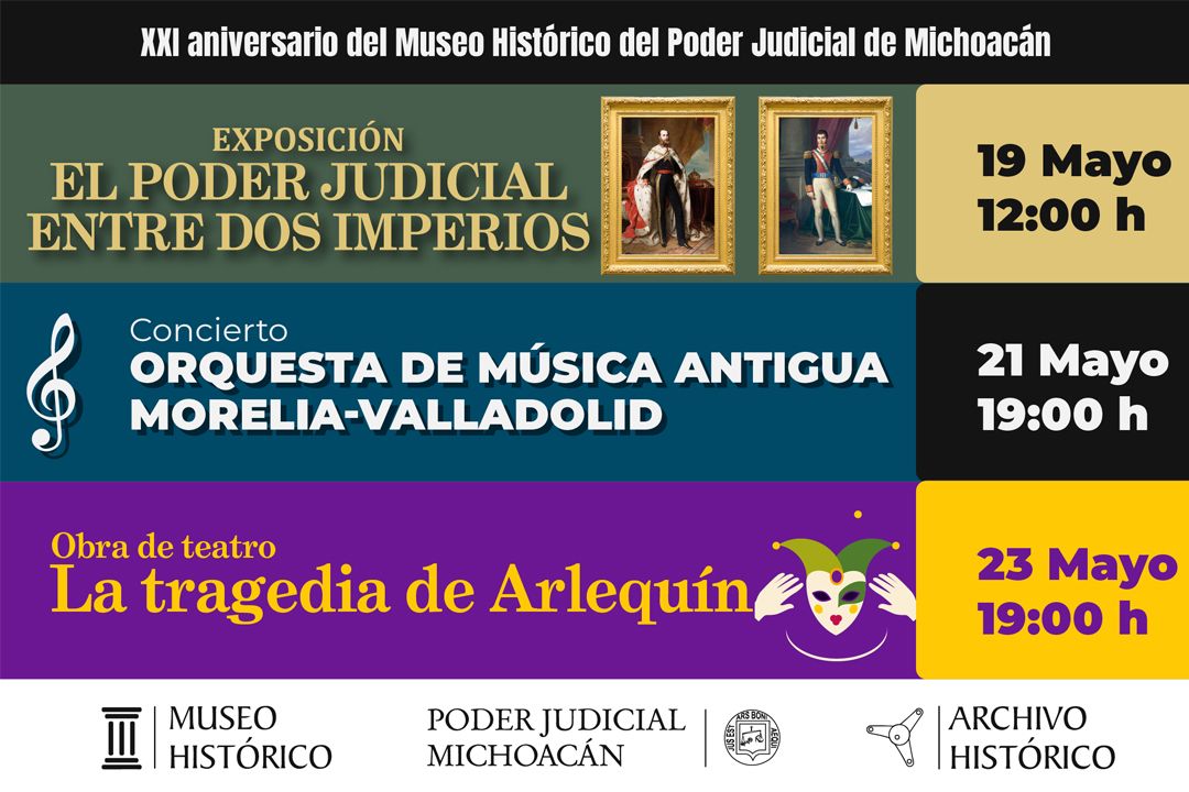Con motivo del XXI aniversario de la creación del Museo Histórico del Poder Judicial de Michoacán, el Consejo ha aprobado la realización de tres actividades que se realizarán en las instalaciones del Museo durante el mes de mayo, con el propósito de contribuir a la difusión de la historia institucional y promover las manifestaciones artísticas.