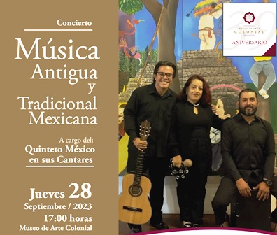 Este jueves 28 de septiembre la Secretaría de Cultura de Michoacán (Secum) celebrará el 39 aniversario del Museo de Arte Colonial con un concierto gratuito de música tradicional mexicana a cargo del quinteto México en sus Cantares, a las 17:00 horas.