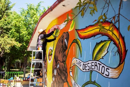 La alumna Cinthya Yunnuén Zoreque compartió la experiencia de 10 días de sus compañeras y compañeros durante la ejecución del mural en su escuela denominado «Serán refrescamos los desiertos del mundo», del artista Gabriel Ávalos Sánchez. «Nos gusta mucho ver el resultado y tener un mural lleno de color con mensaje en nuestra escuela. ¡Muchas gracias!», compartió.