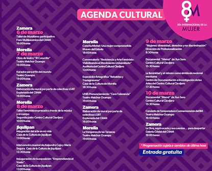 En el marco del Día Internacional de la Mujer, la Secretaría de Cultura de Michoacán (Secum) presenta las actividades artístico culturales que se realizarán del 6 al 10 de marzo en los diferentes recintos de la dependencia, con acceso gratuito.