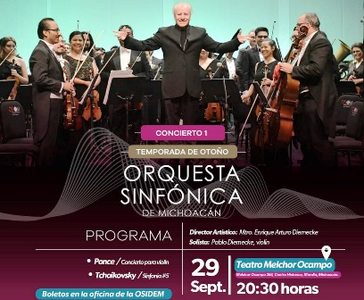 La Secretaría de Cultura de Michoacán (Secum) invita al primer concierto de la  temporada de otoño de la Orquesta Sinfónica de Michoacán (Osidem), bajo la batuta del director artístico Enrique Arturo Diemecke, a disfrutarse este viernes 29 de septiembre a las 20:30 horas en el Teatro Melchor Ocampo, en Morelia.