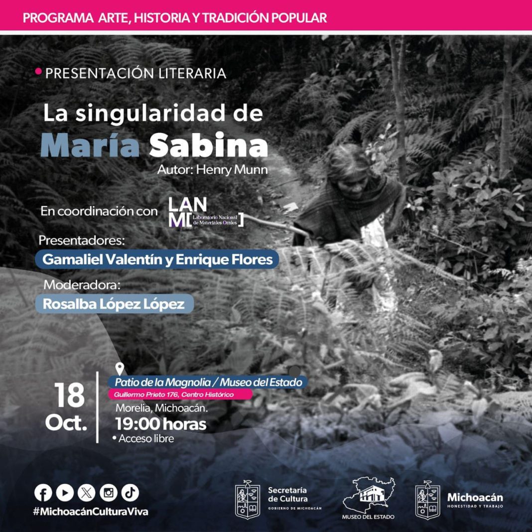 Morelia, Michoacán.- Por primera vez en versión bilingüe, la traducción del ensayo de Henry Munn “La singularidad de María Sabina”, o “The Uniqueness of Maria Sabina”, se presentará en el Museo del Estado el 18 de octubre, a las 19:00 horas, en una edición y traducción de Enrique Flores e Isaac Magaña; gracias al respaldo de la Secretaría de Cultura de Michoacán, en colaboración con el Laboratorio Nacional de Materiales Orales (LANMO) de la Escuela Nacional de Estudios Superiores campus Morelia, de la Universidad Nacional Autónoma de México.