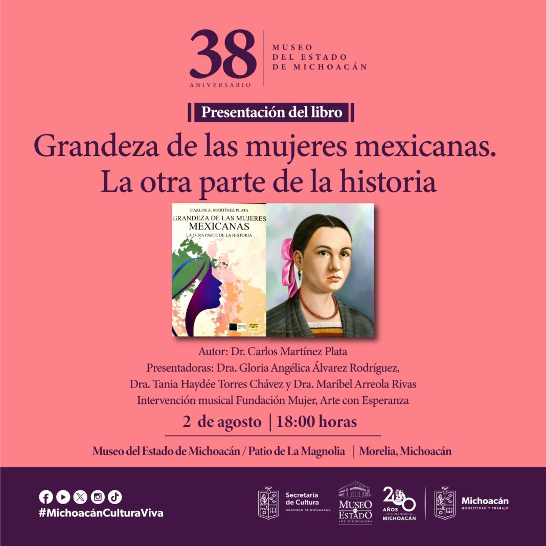 Morelia, Michoacán.- La Secretaría de Cultura de Michoacán (Secum) invita a la presentación del libro, Grandeza de las mujeres mexicanas, del autor Carlos Martínez Plata, una obra biográfica de 51 mujeres mexicanas que han desafiado los modelos tradicionales para contribuir a las causas nacionales.