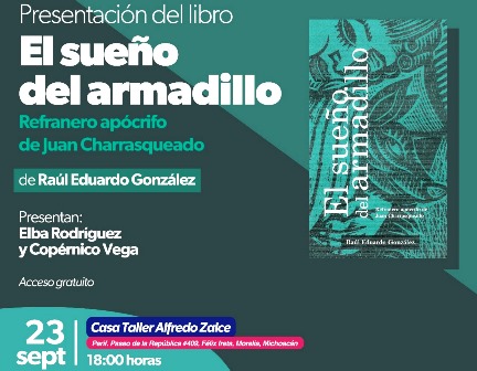 Poco más de 150 décimas (estrofas de diez versos octosílabos), que rematan con refranes y dichos populares mexicanos, nutren “El sueño del armadillo. Refranero apócrifo de Juan Charrasqueado”, autoría de Raúl Eduardo González, que se presentará el 23 de septiembre, a las 18:00 horas, en la Casa Taller Alfredo Zalce.