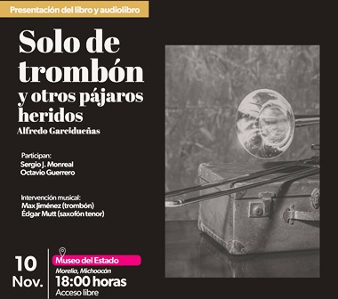 La Secretaría de Cultura de Michoacán (Secum) presentará el próximo 10 de noviembre a las 18:00 horas en el Museo del Estado, el libro de poesía Solo de trombón y otros pájaros heridos, de Alfredo Garcidueñas, el cual resultó ganador de la convocatoria Palabras de Colibrí.