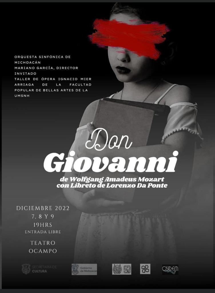 La Universidad Michoacana de San Nicolás de Hidalgo (UMSNH), la Orquesta Sinfónica de Michoacán y el Taller de ópera “Ignacio Mier Arriaga” invitan a la presentación de “Don Giovanni”, de Wolfang Amadeus Mozart con Libreto de Lorenzo Da Ponte.