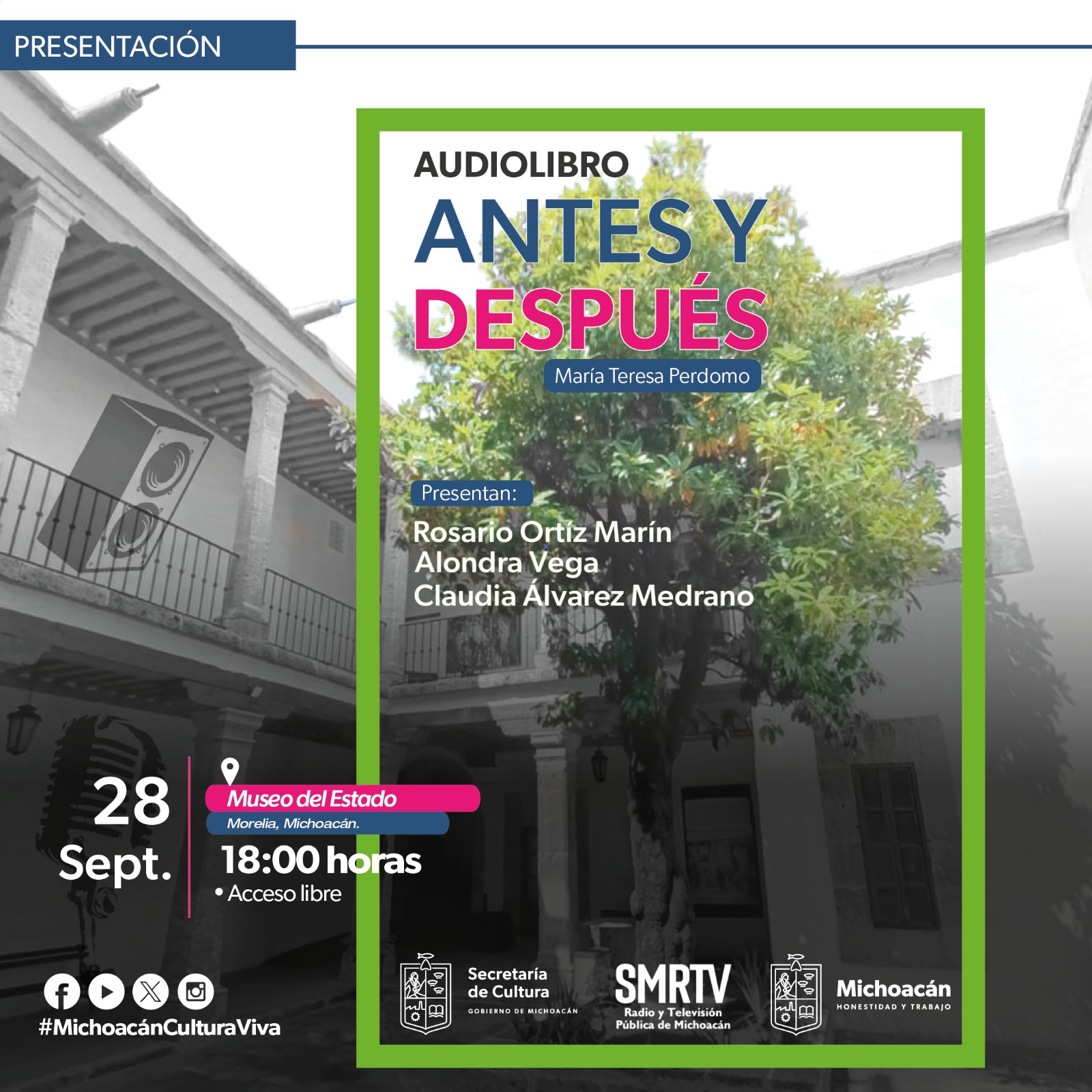 Morelia, Michoacán.- La Secretaría de Cultura de Michoacán (Secum) y el Sistema Michoacano de Radio y Televisión (SMRTV) invitan a la presentación del audiolibro Antes y después, de la escritora María Teresa Perdomo, el próximo 28 de septiembre a las 18:00 horas en el Museo del Estado.