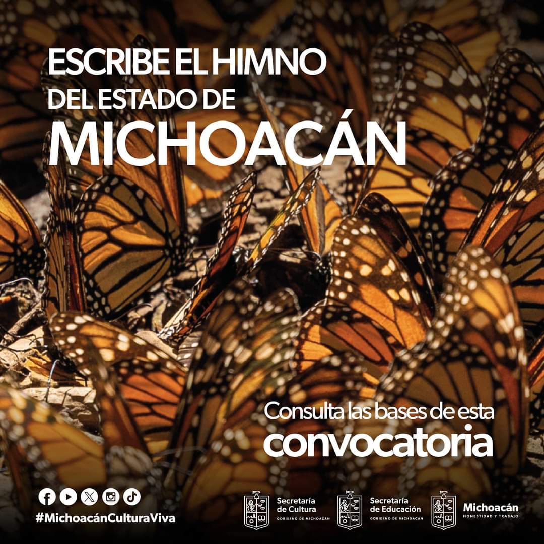 Morelia, Michoacán.- La Secretaría de Cultura del estado (Secum) invita a la ciudadanía a exaltar la belleza de las tierras michoacanas, la calidad de su gente, sus orígenes y tradiciones, en la letra del himno de Michoacán, a través de la convocatoria que encabeza el Gobierno estatal, y que tiene como fecha límite el 8 de enero de 2024.