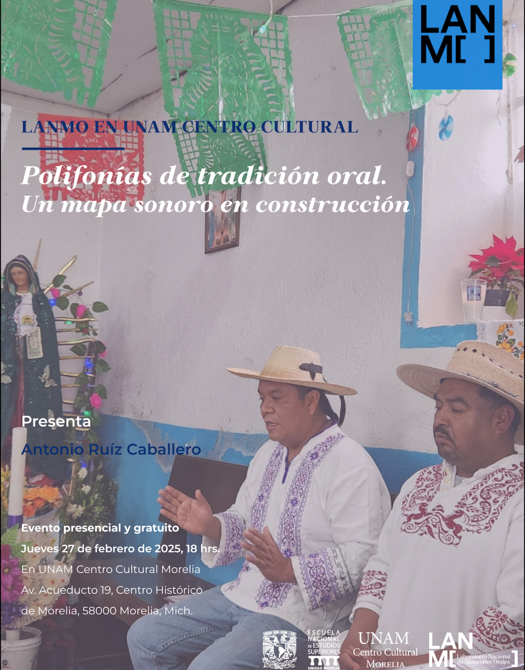 El UNAM Centro Cultural Morelia, de la Escuela Nacional de Estudios Superiores (ENES Morelia UNAM) será sede de la presentación de un mapa sonoro de las polifonías religiosas de tradición oral en diversas regiones del país, realizado por Antonio Ruíz Caballero, en el marco del ciclo del Laboratorio Nacional de Materiales Orales (LANMO) en la UNAM Centro Cultural Morelia.