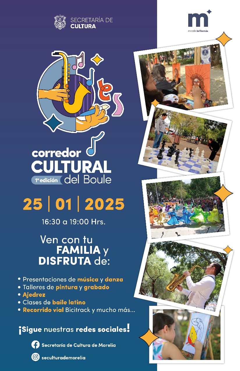 Con el Corredor Cultural del Boule, explicó Chávez Alcaraz, el Gobierno de Morelia trabaja para garantizar el derecho de la ciudadanía a participar en la vida cultural y al disfrute de las artes, se fortalece la colaboración y coordinación con las compañías artísticas de Morelia, además de promover el talento local y proyectar el trabajo de las y los artistas morelianos.