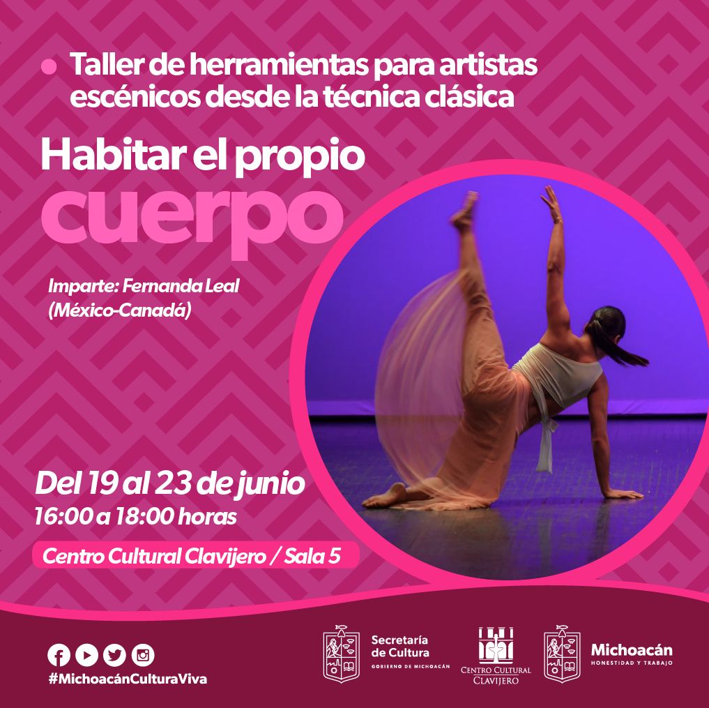 Morelia, Michoacán.- La Secretaría de Cultura de Michoacán (Secum) invita a los talleres de danza Habitar el propio cuerpo y Búsqueda de lenguaje, que se realizarán del 19 al 23 de junio del año en curso, en la sala 5 del Centro Cultural Clavijero, de 16:00 a 18:00 horas, y de 18:00 a 20:00 horas, respectivamente.