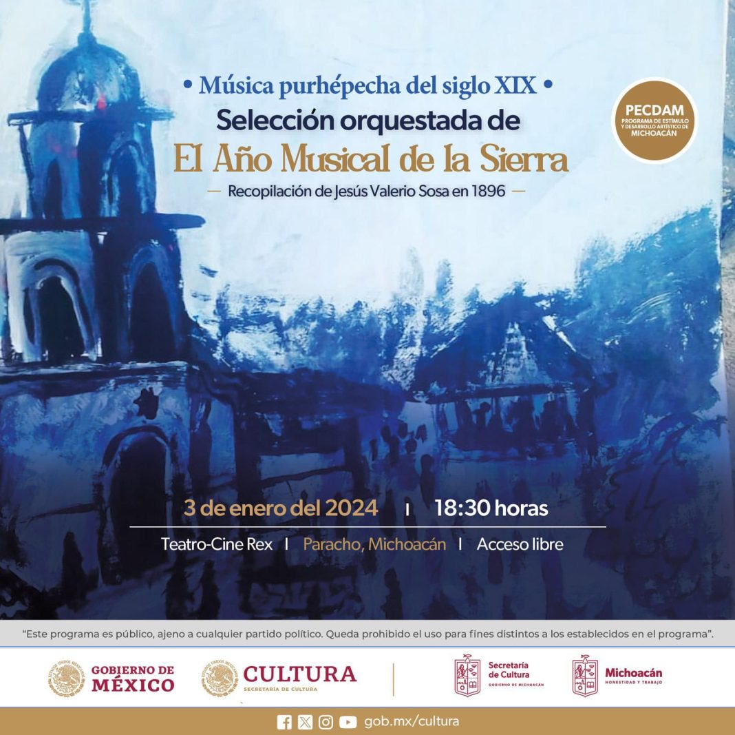 Paracho, Michoacán.- La Secretaría de Cultura de Michoacán (Secum) invita a toda la población a disfrutar el próximo 3 de enero del recital de música purépecha del siglo XIX, en el municipio de Paracho; un concierto derivado del proyecto de investigación del promotor cultural Enrique Ortiz Madrigal, beneficiario del Programa de Estímulo a la Creación y al Desarrollo Artístico de Michoacán (PECDA) 2023.