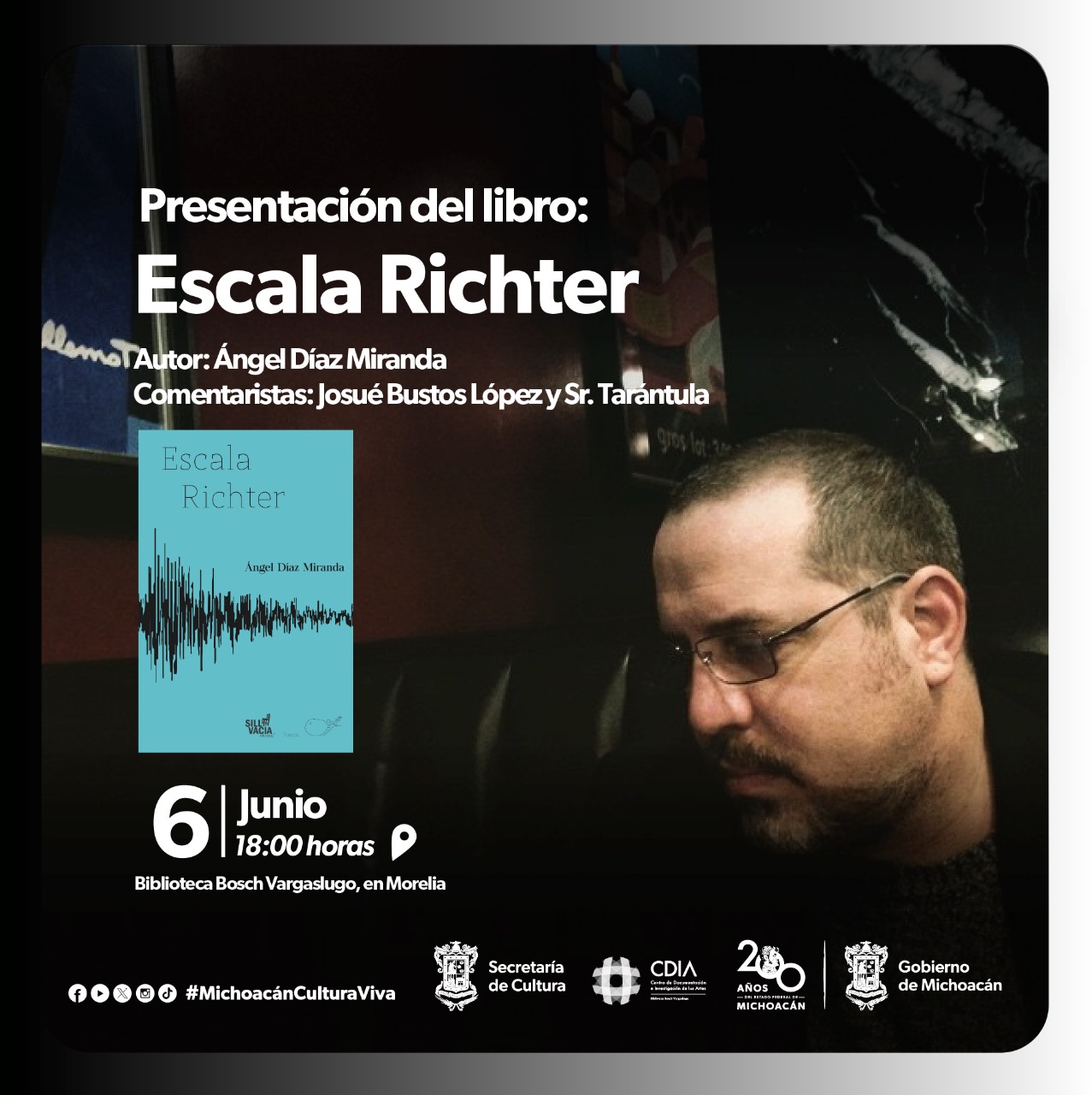 Morelia, Michoacán.- La poesía concebida más allá de nuestras fronteras llegará hasta la Biblioteca Bosch-Vargaslugo, a través de la presentación del libro Escala Richter, del escritor puertorriqueño y profesor del Hollins University de Virginia, Estados Unidos, Ángel Díaz Miranda, que la Secretaría de Cultura de Michoacán (Secum) traerá para ti este 6 de junio, a las 18:00 horas.