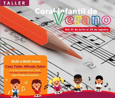 La Secretaría de Cultura de Michoacán (Secum) abre el taller de coro infantil de verano, dirigido a niñas y niños de 8 a 12 años de edad, a impartirse en la Casa Taller Alfredo Zalce, del 31 de julio al 15 de agosto.