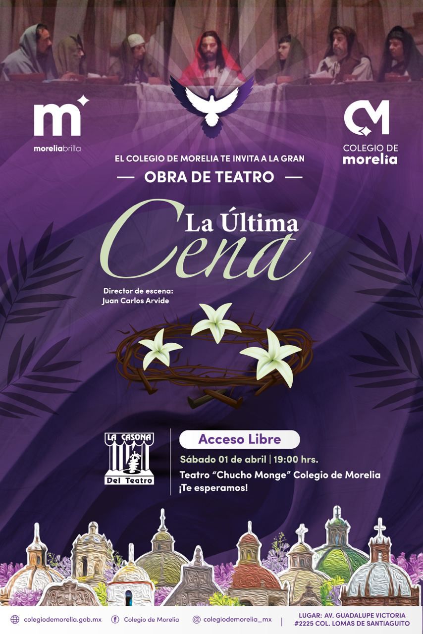 OBRA LA ULTIMA CEl Teatro “Chucho Monge” del Colegio de Morelia será el escenario donde se presentará la puesta en escena “La Última Cena”, del director Juan Carlos Arvide, en la que se presentará a un Jesús natural, humano y en confrontación consigo mismo ante su eminente calvario, abordando el tema desde un aspecto histórico reflexivo, que si bien fue verdad, también está rodeado de misterio.