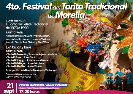 En el marco de su Programa Arte, Historia y Tradición Popular, el próximo 21 de septiembre, a las 17:00 horas, el Museo del Estado será sede del 4to. Festival del Torito Tradicional de Morelia, el cual ofrecerá una conferencia y la exhibición pública de toritos, que partirá del recinto cultural a la Plaza Benito Juárez.