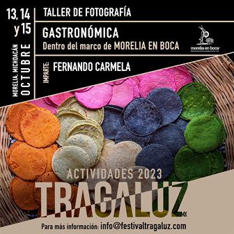 El Festival de Imagen y Fotografía “TRAGALUZ” presentó al público su segunda propuesta de actividades con el “Taller de Fotografía Gastronómica”, que se realizará del 13 al 15 de octubre en las instalaciones del Centro Cultural Clavijero en Morelia, Michoacán.