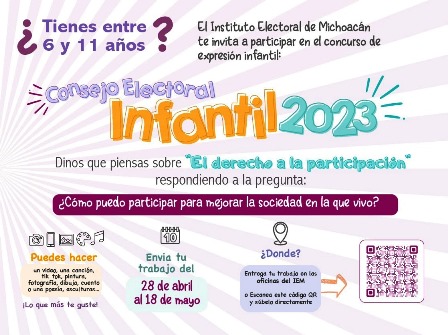 secum cincurso 1705La Secretaría de Cultura estatal (Secum) convoca a participar en el concurso de expresión infantil Nuestro arte, nuestros derechos, para conformar el Consejo Electoral Infantil 2023, que encabeza el Instituto Electoral de Michoacán (IEM).
