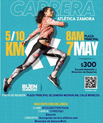 Luego de 10 años de no contar con una actividad deportiva de esta magnitud, el Ayuntamiento de Zamora, encabezado por Carlos Alberto Soto Delgado, programó para el próximo domingo 7 de mayo en punto de las 08:00 horas, la celebración de la Carrera Atlética Zamora 2023, con una participación máxima de 300 personas, quienes podrán competir por una bolsa en efectivo de 20 mil pesos, en un circuito que tendrá como salida y meta en la plaza principal sobre la calle Morelos.