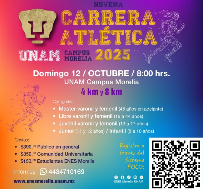 La Escuela Nacional de Estudios Superiores (ENES Morelia UNAM) llevará a cabo la “9ª. Carrera Atlética de la UNAM Campus Morelia” el próximo domingo 12 de octubre de 2025 en las instalaciones de su sede universitaria.