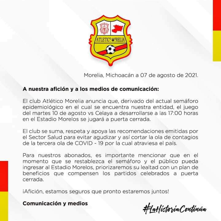 A través de un comunicado, dieron a conocer que el encuentro que sostendrá como local el Atlético Morelia como marco de la tercera jornada de la Liga de Expansión este martes 10 de agosto contra Celaya a las 17:00 horas será a puerta cerrada, tras las medidas que se están aplicando por parte de las autoridades para evitar concentraciones masivas y con ello contagios de Covid-19.