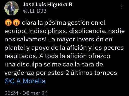 Y en otro mensaje, José Luis Higuera menciona el papel que han desempeñado los jugadores: “Tal parece que mientras más mejoramos las instalaciones y herramientas a nuestros jugadores menos lo valoran”.