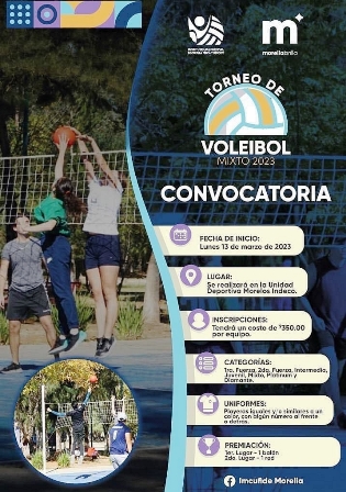torneo voli 1502El Ayuntamiento de Morelia, a través del Instituto Municipal de Cultura Física y Deporte (Imcufide), invita a participar en el Primer Torneo de Voleibol Mixto, mismo que se pondrá en marcha a partir del día 13 de marzo, en las instalaciones de la Unidad Deportiva Morelos-INDECO.