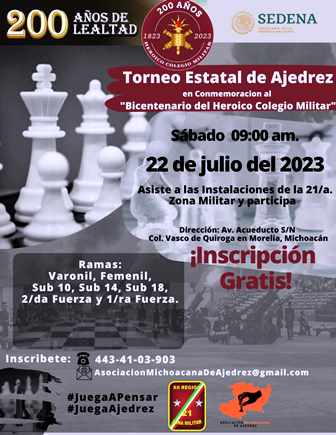 La Secretaría de la Defensa Nacional a través de la Comandancia de la 21/a. Zona Militar, hace una atenta invitación al público en general, para que asistan este próximo sábado 22 de julio del presente año, al Torneo Estatal de Ajedrez en Conmemoración al “Bicentenario del Heroico Colegio Militar”.
