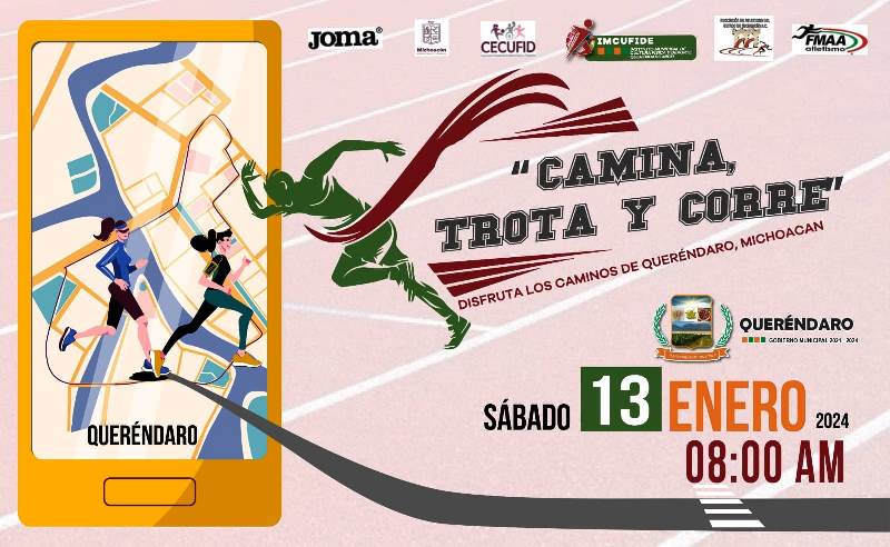 Este viernes se tendrá el cierre de inscripciones para los interesados en participar en la competencia atlética “Camina, Trota y Corre”, que como parte de las actividades del Campeonato Nacional de Campo Traviesa que se verificará en Queréndaro, se celebrará este sábado 13 de enero a partir de las 8 horas con distancias de 2, 4 y 6 kilómetros para atletas de las 10 a los 80 años de edad, tanto en la rama femenil como en la varonil.