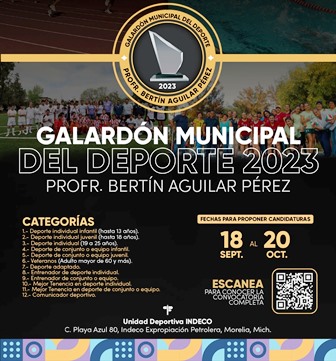 Se trata del Galardón Municipal “Bertín Aguilar Pérez” 2023 para el cual podrán realizar las nominaciones en cada una de las 12 categorías incluidas en la edición de este año a partir de este martes 19 de septiembre y hasta el próximo 20 de octubre en las instalaciones de la Unidad Deportiva Morelos Indeco del IMCUFIDE.