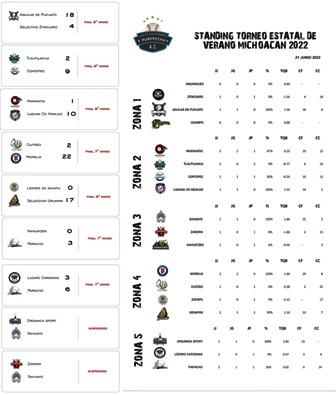 Por lo pronto, en la Zona 1, Águilas de Pucuato se mantiene liderando, mientras que en la Zona 2, Laguna Cd Hidalgo se mantiene con el mejor porcentaje, pero a falta de partidos jugados, mientras que en la Zona 3, Sahuayo se mantiene liderando.