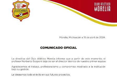 “La directiva del Club Atlético Morelia informa que a partir de este momento, el profesor Norberto Scoponi deja de ser el director técnico en nuestro primer equipo”, dice el comunicado sobre el retiro del técnico que llegó luego del cese de Israel Hernández Pats; la llegada del llamado “Gringo”, se dio el 22 de febrero y debutó con una derrota ante Cimarrones de Sonora 0-1.