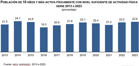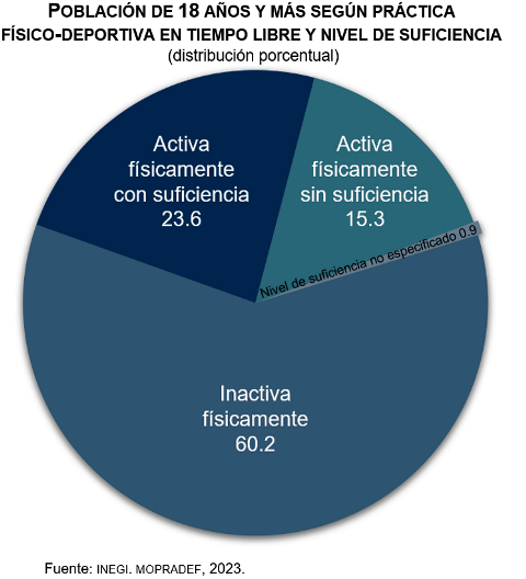 En 2023, de la población total de 18 años y más, 23.6 % realizó alguna actividad físico-deportiva con un nivel suficiente en su tiempo libre, mientras que 76.4 % no estaba activo físicamente o no lo hacía de manera suficiente. En cuanto a la proporción de personas de