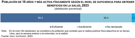 Al valorar la actividad física según el nivel de suficiencia, se detectó que de la población de 18 años y más, 23.6 % realizó actividad física con un nivel suficiente -al menos tres días por semana y que acumula un tiempo mínimo de 75 minutos con una intensidad vigorosa o 150 minutos con intensidad moderada-, para obtener beneficios a su salud, mientras que 15.3 % realizó actividad física de forma insuficiente. La población que no realizó actividad física alcanzó 60.2 %.