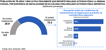 Referente a los lugares e instalaciones públicos para realizar actividades físicas o deportivas, siete de cada 10 personas declararon que sí cuentan con esos espacios en su colonia; de estas, 48.3 % mencionó que las instalaciones se encuentran en condiciones regulares.