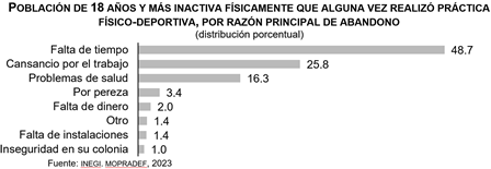 De la población de 18 años y más que alguna vez efectuó alguna actividad, 48.7 % mencionó que la falta de tiempo es el principal motivo por el que dejó de realizar alguna práctica físico-deportiva. El cansancio por el trabajo y los problemas de salud fueron las siguientes razones más comunes.