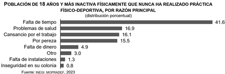 La población que nunca ha realizado alguna práctica físico-deportiva mencionó como motivos principales la falta de tiempo (41.6 %), problemas de salud (16.9 %) y cansancio por el trabajo (16.1 %).