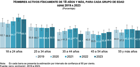 En 2023, entre los hombres que realizaron algún tipo de actividad física, el grupo de 18 a 24 años tuvo la mayor participación con 69.5 por ciento. En contraste, el grupo de edad de 35 a 44 años tuvo la menor participación en esta actividad, con 34.1 por ciento. Cabe destacar que este último grupo experimentó un descenso de 13.5 puntos porcentuales en comparación con los datos de 2022.