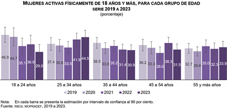 Durante 2023, en términos de actividad física realizada por mujeres, el grupo de edad de 25 a 34 años mostró la mayor actividad con 44.5 por ciento. Por otro lado, el grupo de 18 a 24 años reportó la menor participación con 29.0 %, lo que representa una disminución de 7.9 puntos porcentuales en comparación con los datos de 2022.