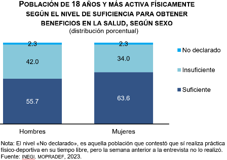 Respecto a la realización de alguna actividad físico-deportiva con nivel suficiente, hay una diferencia de 7.9 puntos porcentuales en la distinción por sexo; las mujeres activas físicamente tuvieron una mayor suficiencia (63.6 %) en comparación con los hombres (55.7 %).