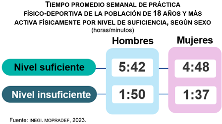 Referente al tiempo semanal dedicado a la práctica físico-deportiva, las mujeres que alcanzaron un nivel suficiente para obtener beneficios de salud invirtieron un promedio de cuatro horas y 48 minutos. Por otro lado, los hombres dedicaron en promedio cinco horas y 42 minutos por semana. Es decir, una diferencia de casi una hora comparada con las mujeres.