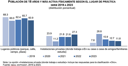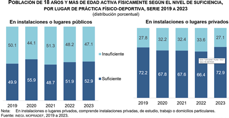 En los diferentes levantamientos del MOPRADEF se ha identificado que el porcentaje de personas con un nivel suficiente de práctica físico-deportiva es mayor entre quienes acuden a instalaciones o lugares privados. En 2023, 72.9 % de quienes realizaron actividades físicas en instalaciones privadas lo hizo con un nivel suficiente, esta fue la frecuencia más alta registrada en los últimos cinco años.