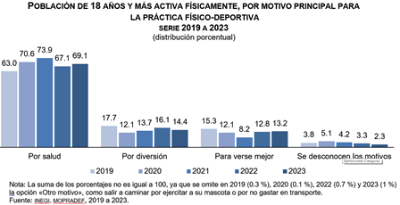 Siete de cada 10 personas mencionaron que el principal motivo para realizar algún tipo de actividad físico-deportiva es por salud. Esta categoría se mantiene como la principal en las distintas series.
