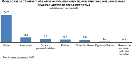 En cuanto a la principal influencia para realizar algún tipo de actividad físico-deportiva, 64.7 % de las personas mencionó no tener influencia de alguien para realizarla.