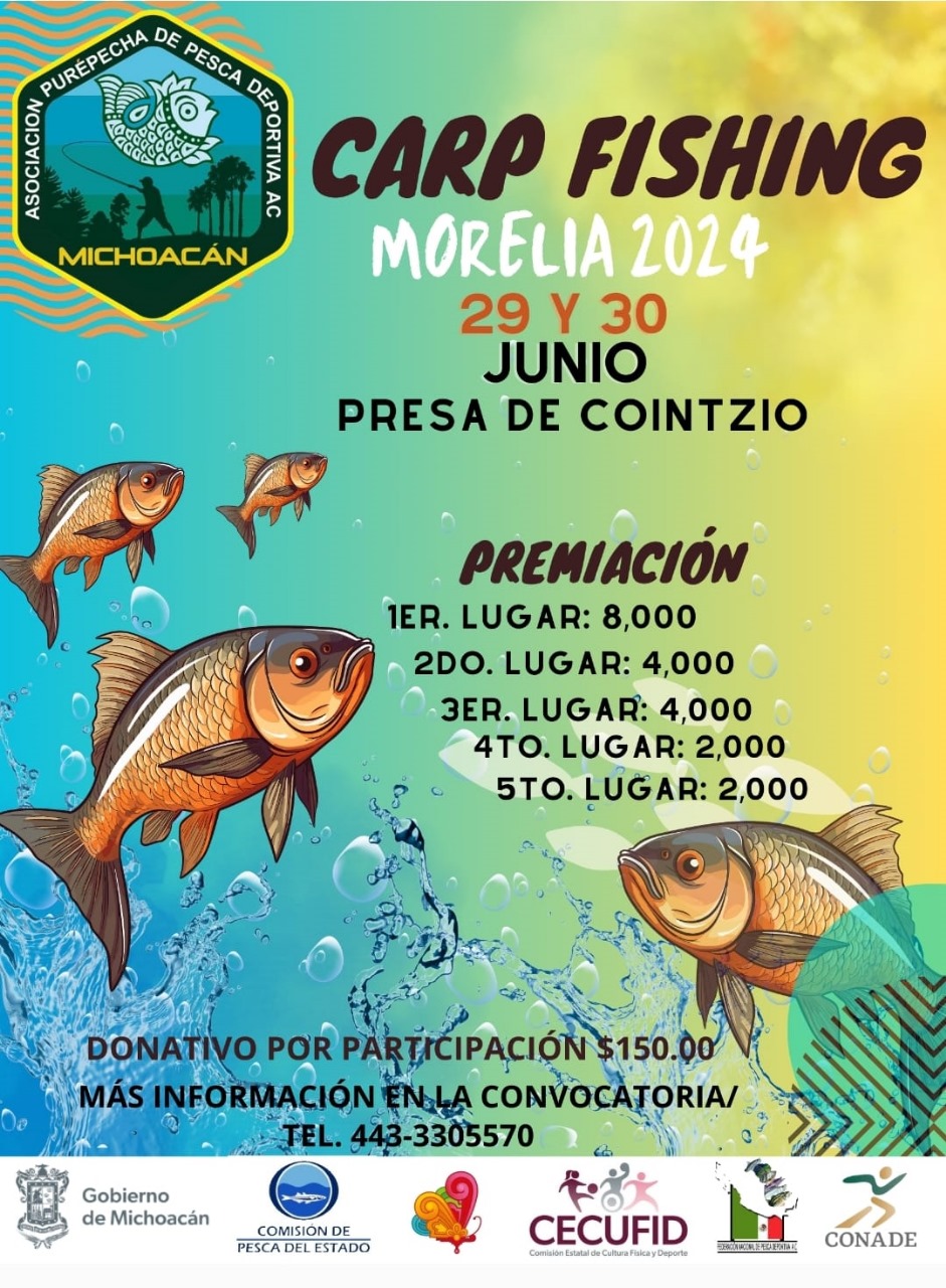 La Comisión de Pesca del Estado de Michoacán (Compesca) y la Asociación Purépecha de Pesca Deportiva invitan al Torneo de Pesca Deportiva Carp Fishing 2024, que se llevará a cabo los días 29 y 30 de junio en la presa de Cointzio.