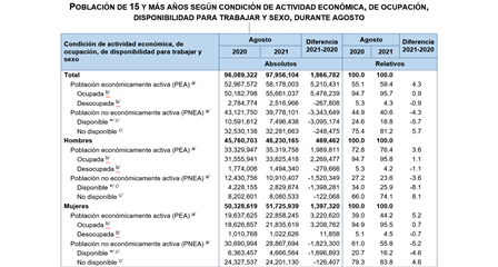 El INEGI informa sobre los principales resultados de la Encuesta Nacional de Ocupación y Empleo, Nueva Edición (ENOEN) para agosto de este año, los cuales indican que 58.2 millones de personas de 15 y más años de edad son Población Económicamente Activa (PEA), lo que representa una Tasa de Participación de 59.4 por ciento. Dicha población es superior en 5.2 millones respecto a la de agosto de 2020. Por su parte, el complemento, la Población No Económicamente Activa (PNEA) fue de 39.8 millones de personas, cifra inferior en 3.3 millones a la de agosto del año previo; a su interior, la PNEA disponible se redujo en 3.1 millones.